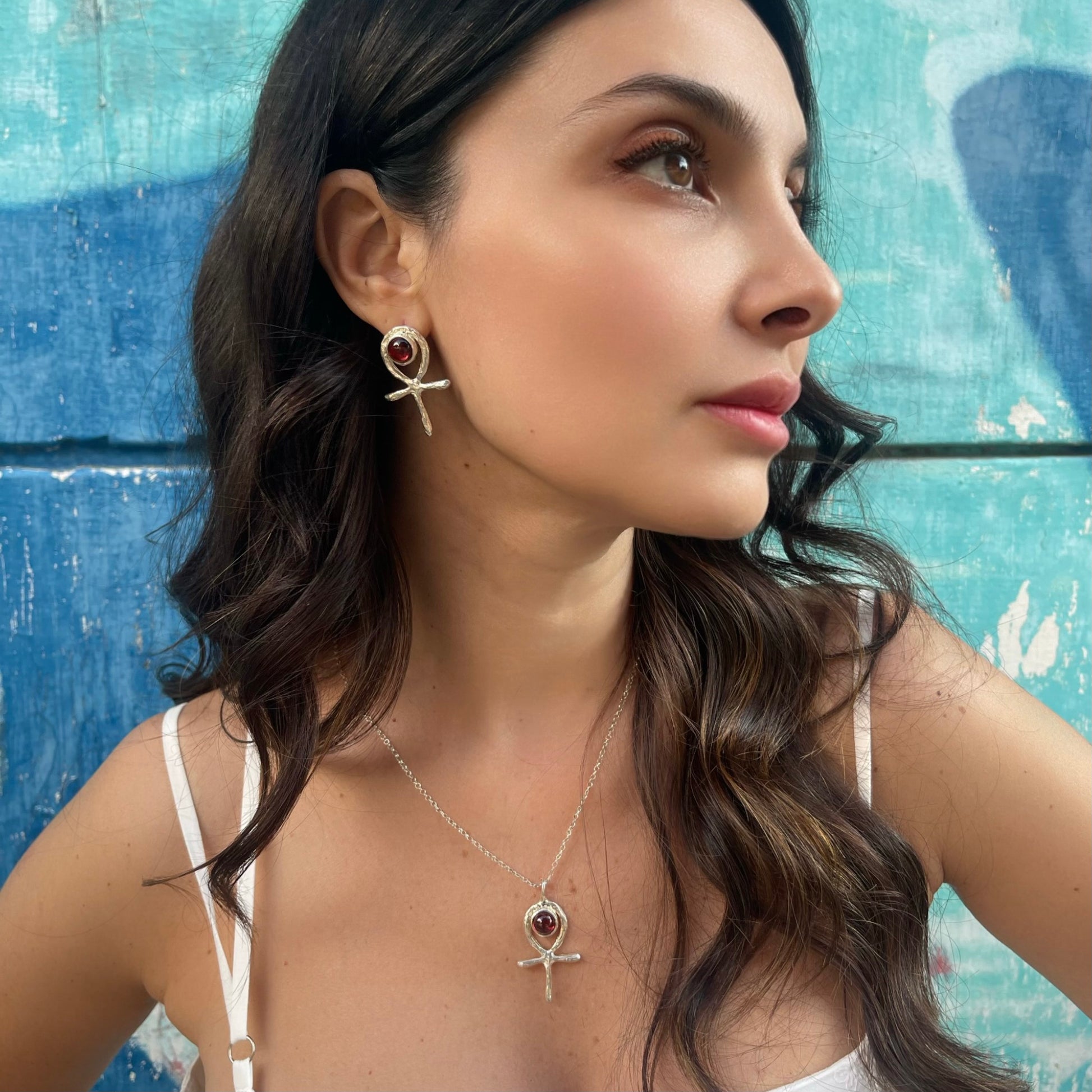 Questo ciondolo sacro, forgiato in argento e impreziosito da un granato naturale, è un antico simbolo egizio di protezione e attivazione spirituale.