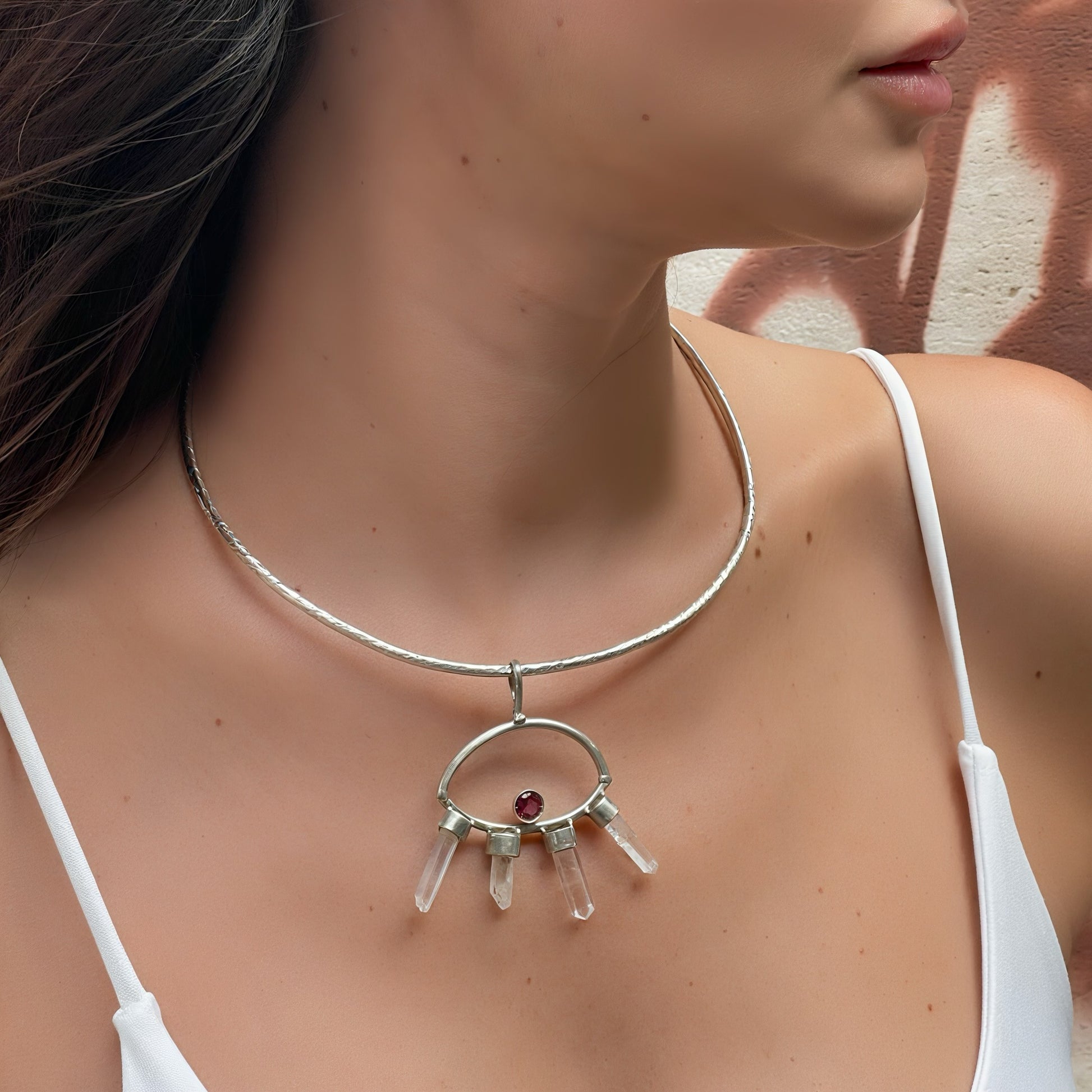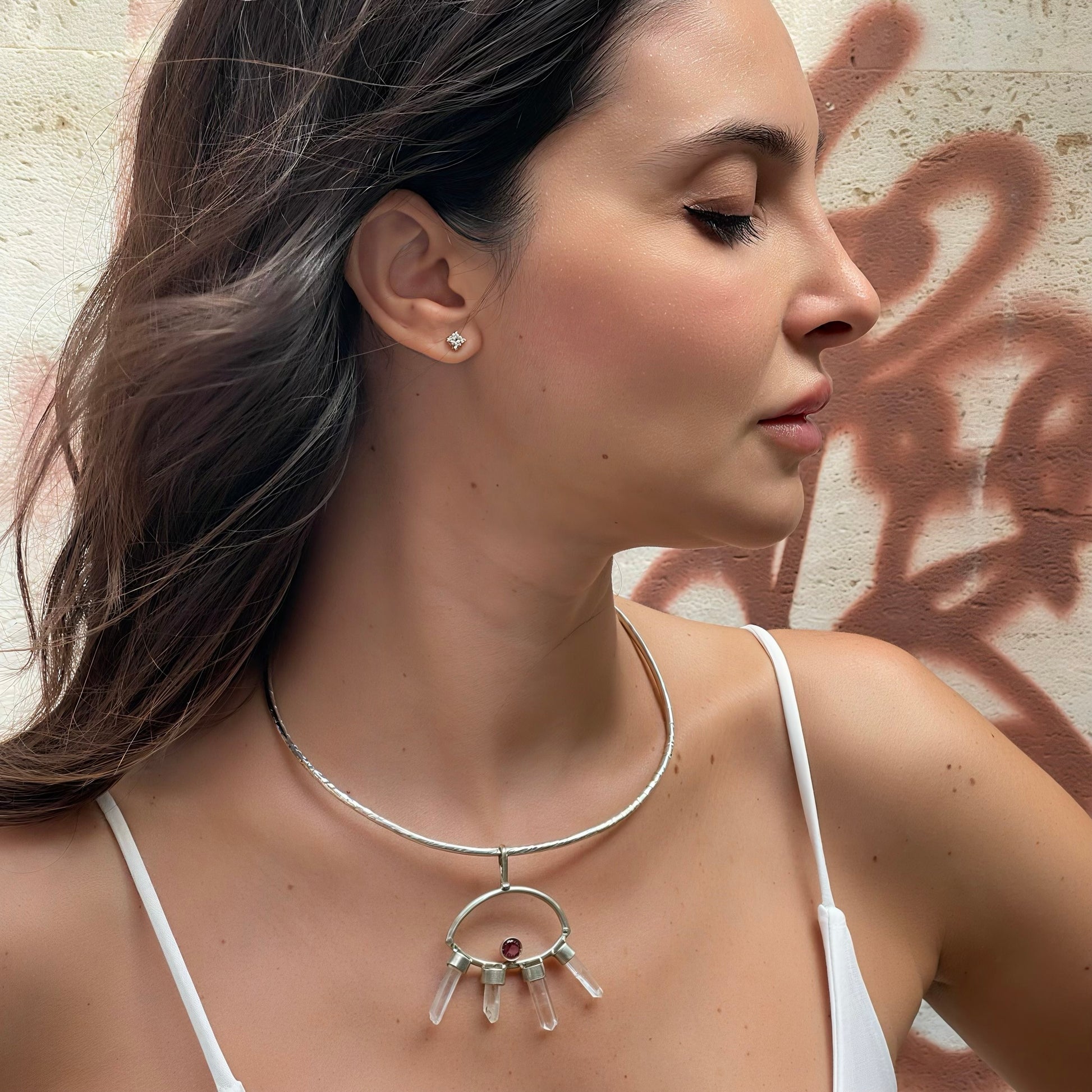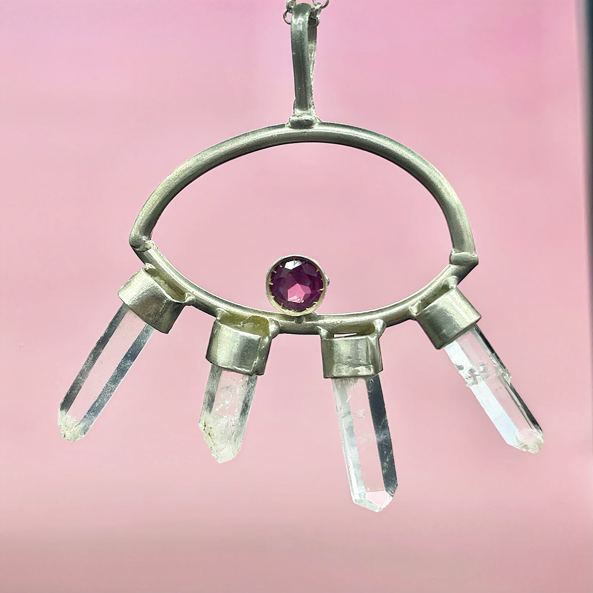 Il Ciondolo Occhio Mistico in Argento è una creazione preziosa e unica, realizzata interamente a mano in argento e impreziosita da una rodolite centrale e da piccole punte di quarzo ialino.