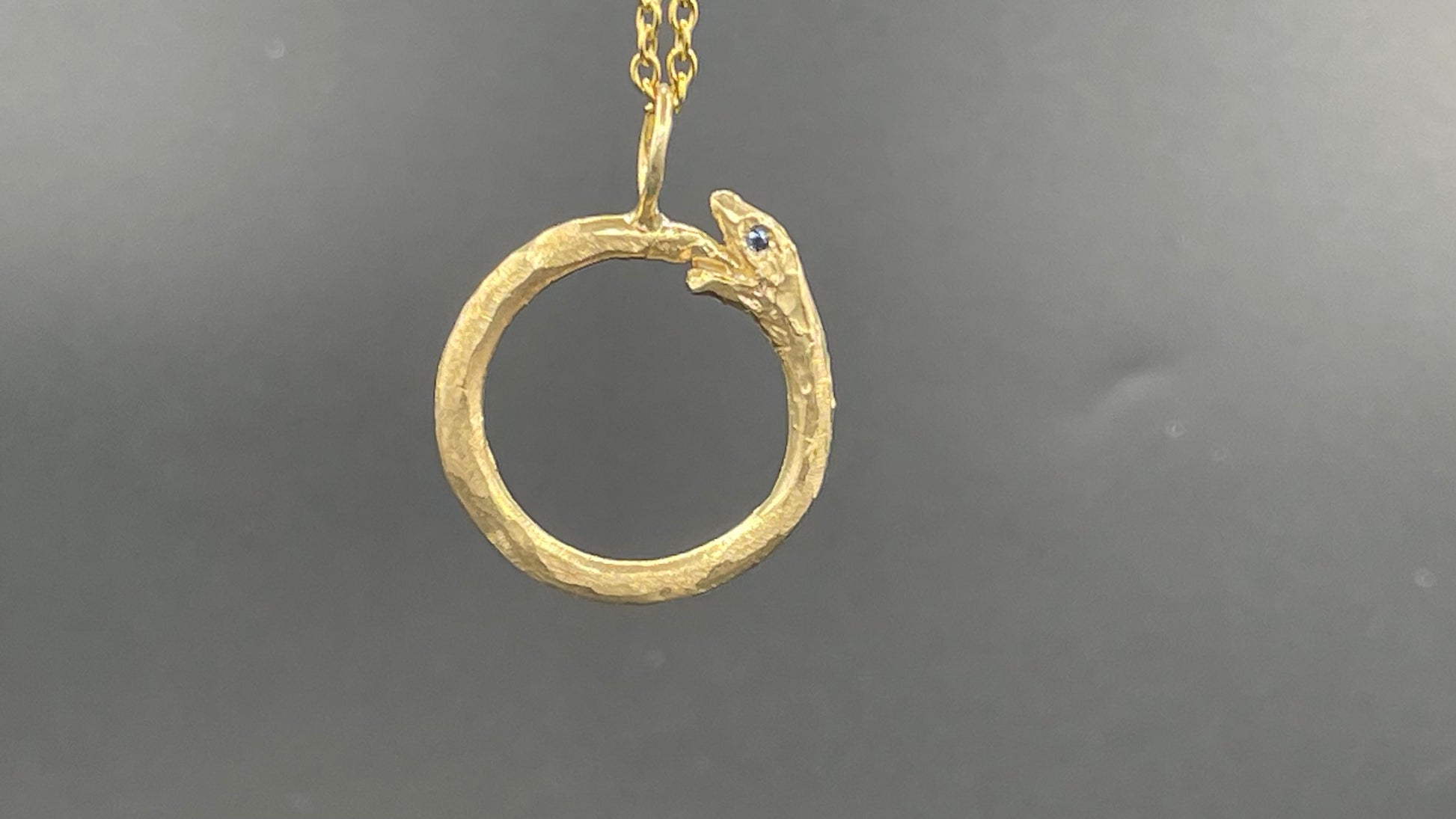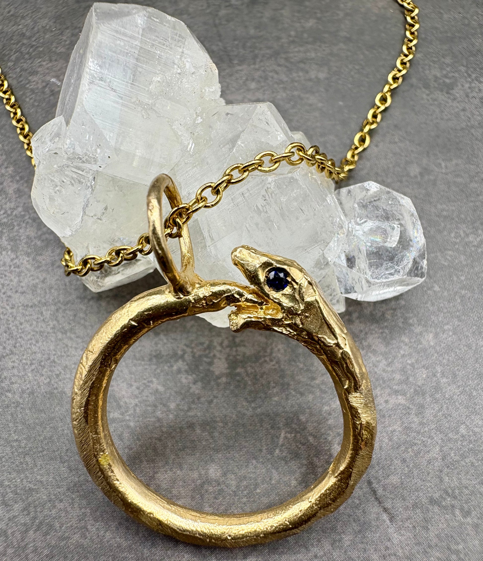 Ciondolo Uroboro in Bronzo con Occhio di Zaffiro – Descrizione Olistica